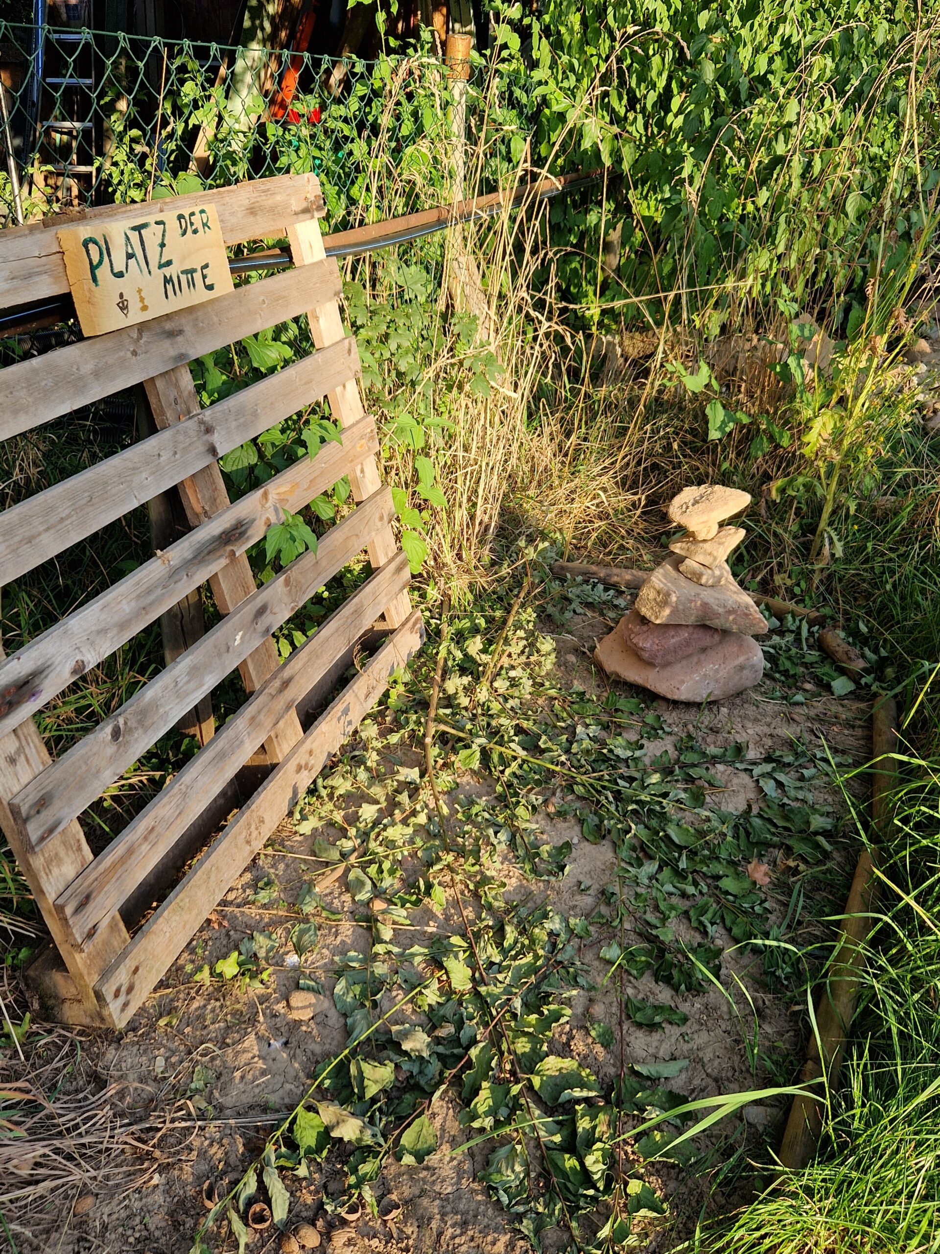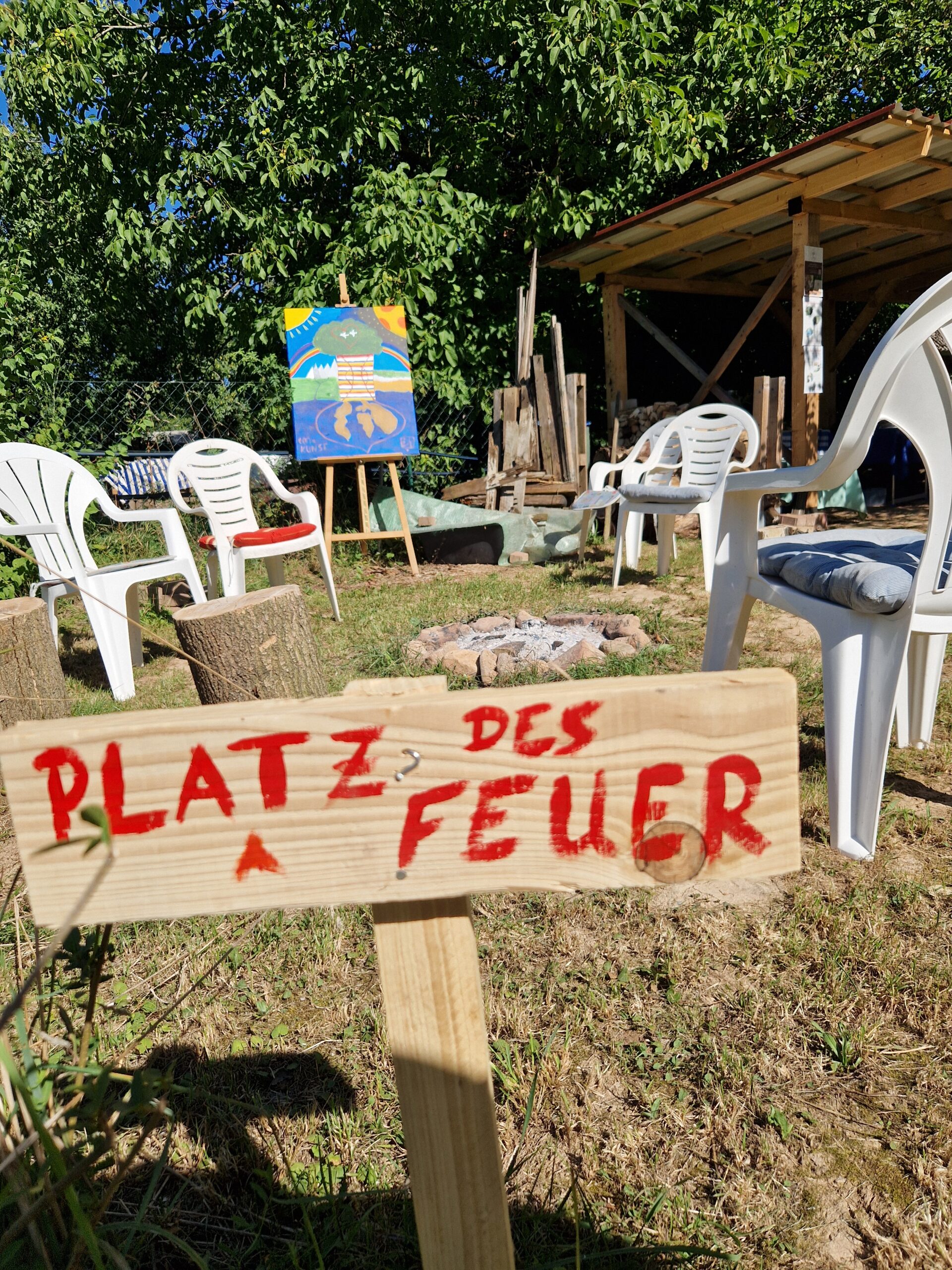 Unser Platz biete eine Feuerstelle, gemütliche Sitzecke, Kochmöglichkeiten, freie Flächen für dein Angebot, sowie ein 4x6m großes Zelt als Schlecht-Wetter-Alternative.